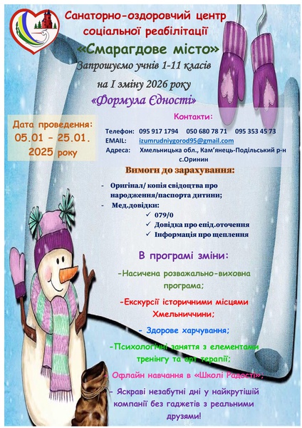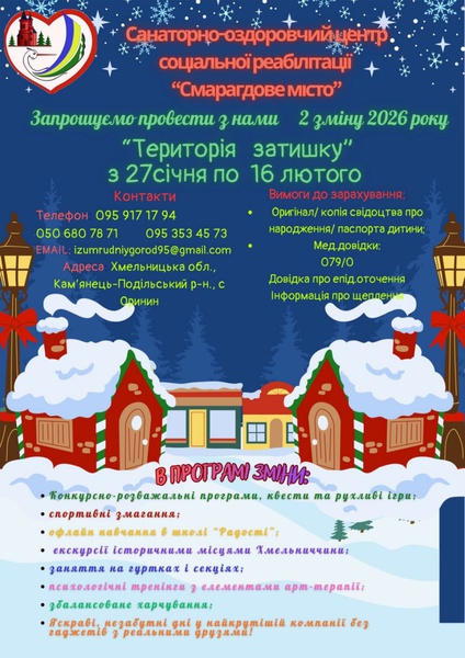 З 27.01.2026 по 16.02.2026 в санаторно-оздоровчому центрі соціальної реабілітації «Смарагдове місто», релокованого до с. Оринин Кам’янець-Подільського району Хмельницької області (далі – СОЦСР «Смарагдове місто»),для дітей віком від 6 до 17 років,відбудеться ІІ тематична зміна «Територія затишку».